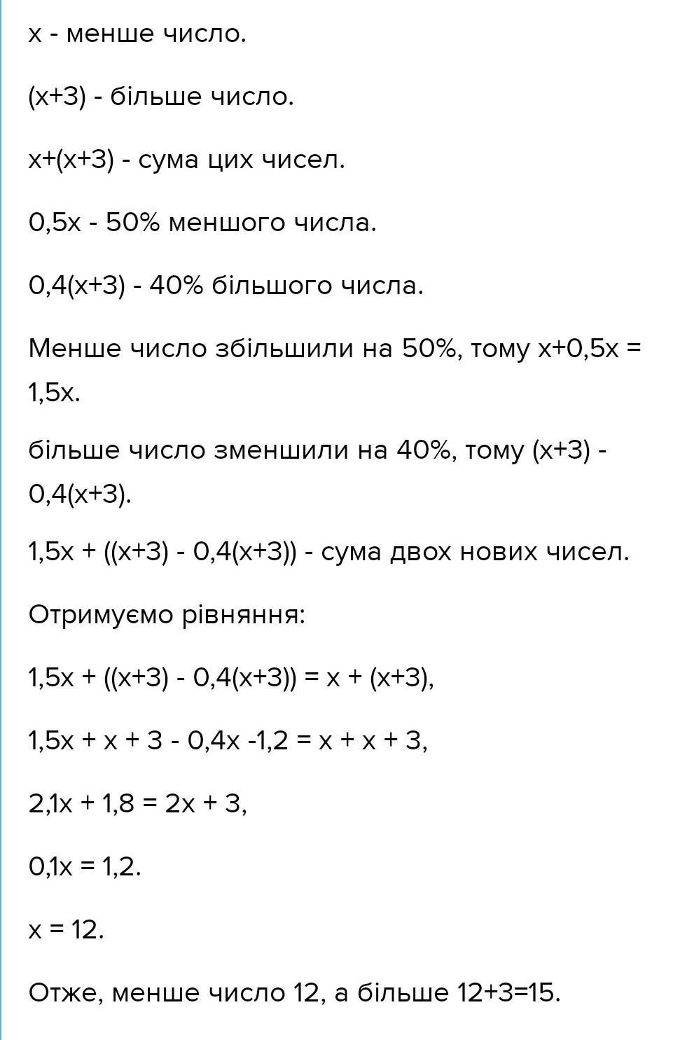 Одне число більше другого на 3. Якщо менше число збільшити на 50%, а більше зменшити на 40%, то їхня сума не зміниться. На скільки процентів перше число більше за друге? На скільки процентів друге число менше за перше,