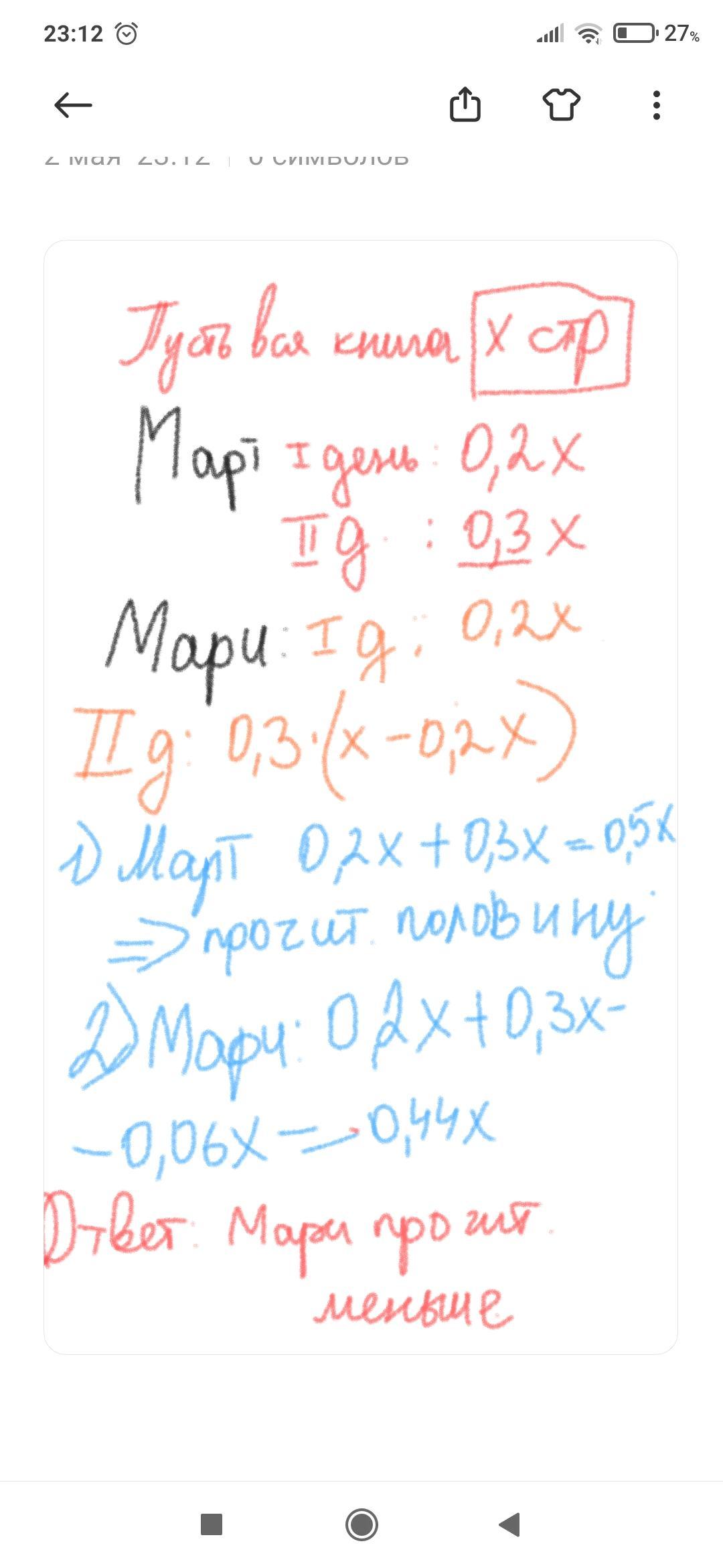 март прочитал 20% книги в первый день и еще 30% во второй день. Мари прочитала 20% книги в первый день и 30% непрочитанной части во второй день. Кто из детей прочитал меньше за два дня, если оба ребенка читали одну и ту же книгу? Обоснуй ответ.