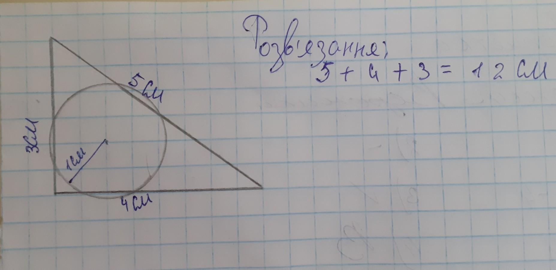 -) Радіус кола, вписаного в прямокутний трикутник, дорівнює 1 см. Знай- діть периметр трикутника, якщо його катети дорівнюють 3 см і 4 см.