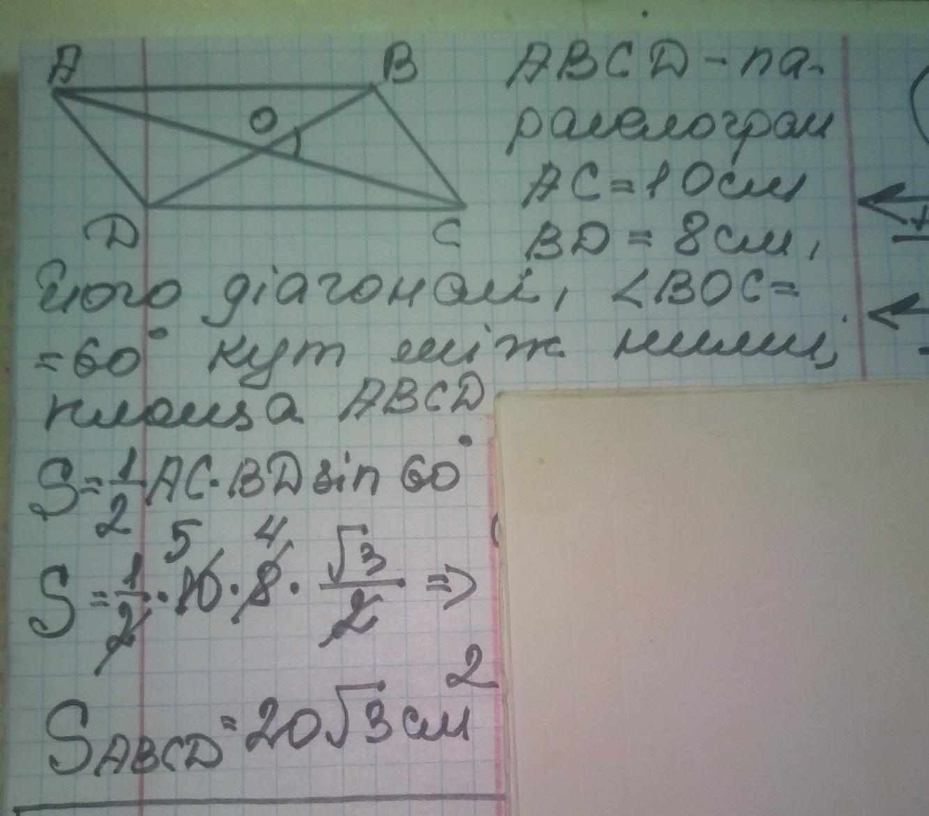 Знайдіть площу паралелограма, якщо його діагоналі дорівню- ють 10 см і 8 см, а кут між ними - 60°.