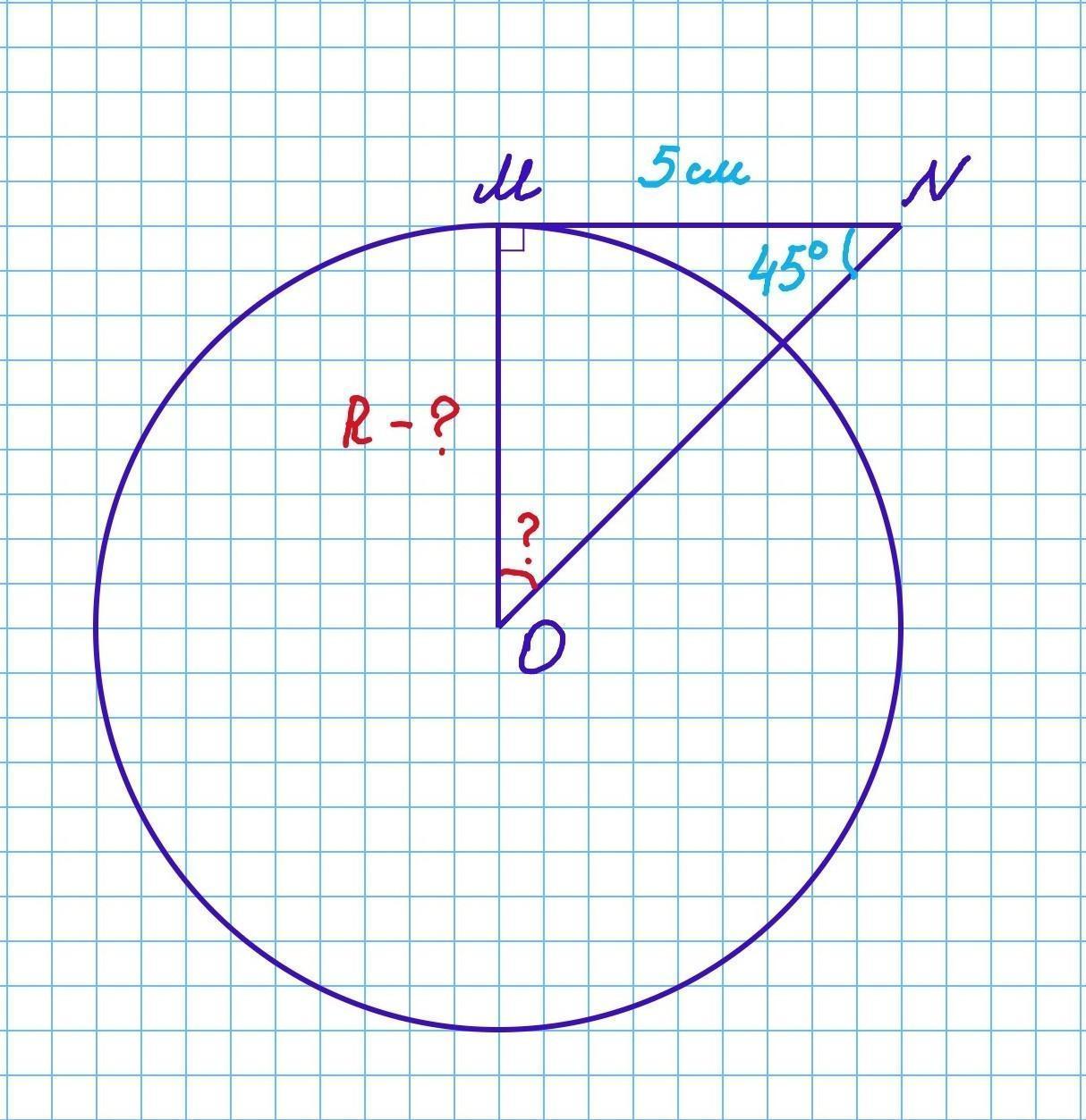 Пряма МР дотикається до кола з центром О в точці М, кут МРО=45 градусів, МР=5 см.Знайдіть радіус кола.