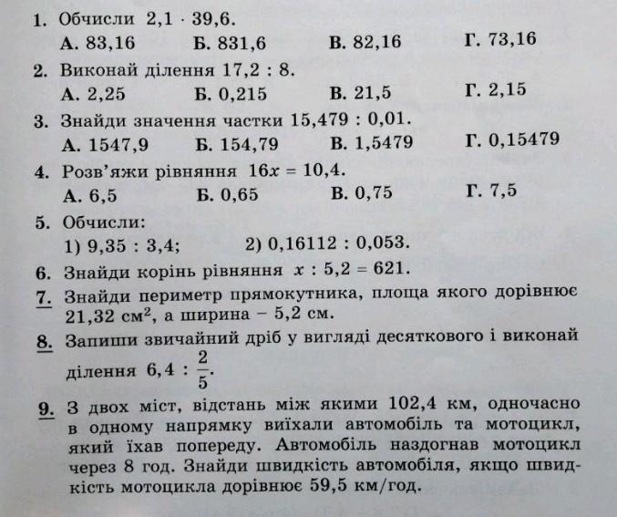 1. Обчисли 2,1 . 39,6. A. 83,16 2. Виконай A. 2,25 Б. 831,6 ділення 17,2 : 8. Б. 0,215 B. 21,5 3. Знайди значення частки 15,479 : 0,01. Б. 154,79 B. 1,5479 A. 1547,9 4. Розв'яжи рівняння 16x = 10,4. A. 6,5 Б. 0,65 5. Обчисли: ділення 6,4 : B. 82,16 - 5 ● B. 0,75 г. 73,16 1) 9,35 3,4; 2) 0,16112 0,053. 6. Знайди корінь рівняння х : 5,2 = 621. 7. Знайди периметр прямокутника, площа якого дорівнює 21,32 см², а ширина - 5,2 см. - 8. Запиши звичайний дріб у вигляді десяткового і виконай 2 Г. 2,15 Г. 0,15479 Г. 7,5 9. З двох міст, відстань між якими 102,4 км, одночасно в одному напрямку виїхали автомобіль та мотоцикл, який їхав попереду. Автомобіль наздогнав мотоцикл через 8 год. Знайди швидкість автомобіля, якщо швид- кiсть мотоцикла дорівнює 59,5 км/год.