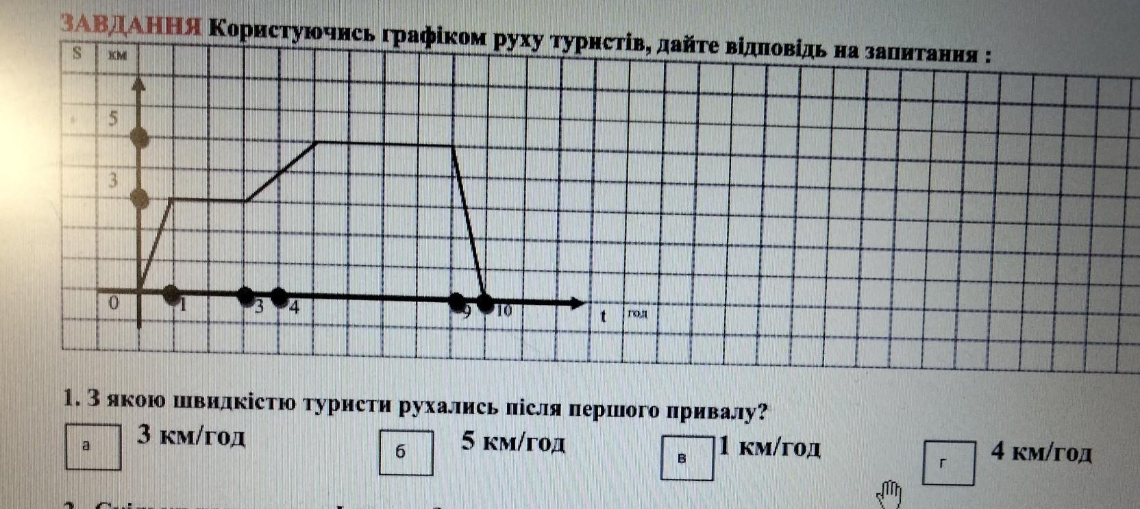 ЗАВДАННЯ Користуючись графіком руху туристiв, дайте відповідь на запитання.З якою швидкістю туристи рухалися після першого привалу :