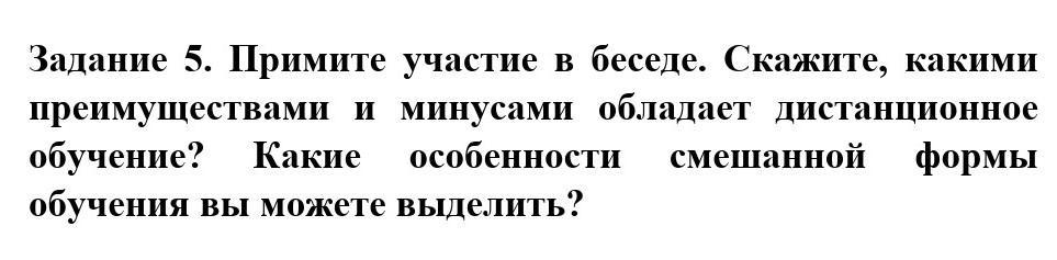 Задание 5. Примите участие в беседе. Скажите, какими преимуществами и минусами обладает дистанционное обучение? Какие особенности смешанной формы обучения вы можете выделить?
