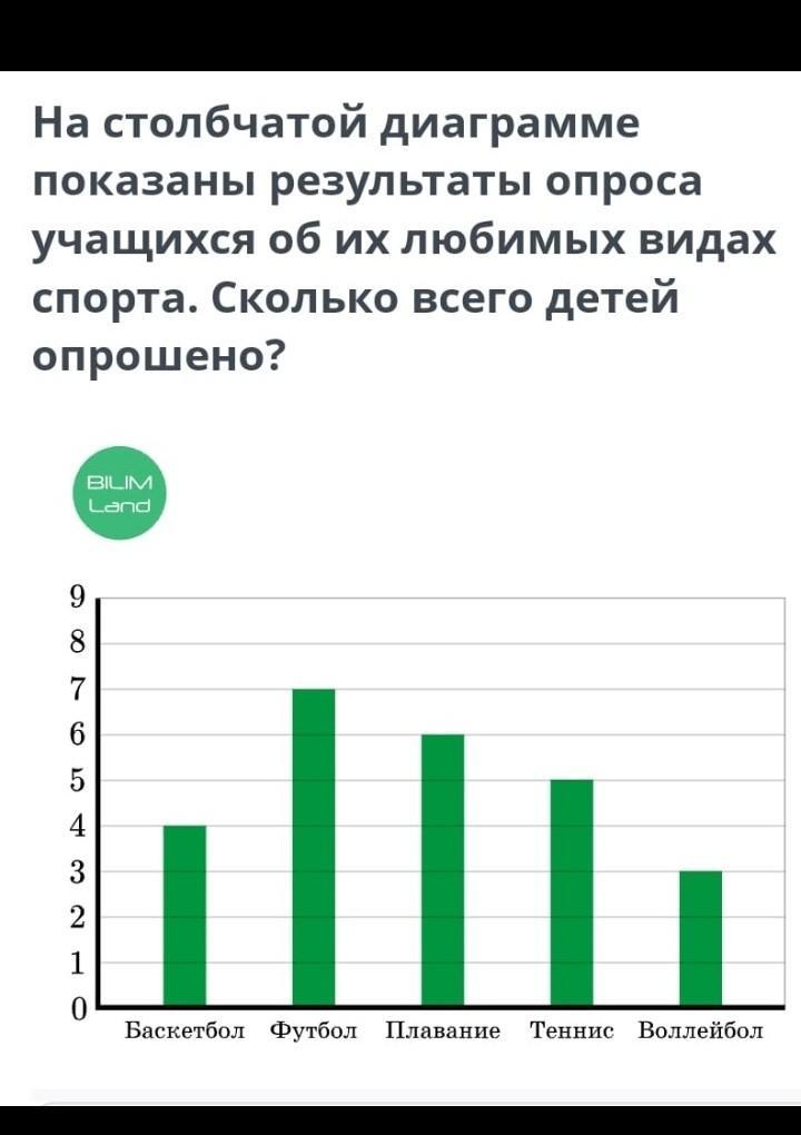 На столбчатой диаграмме показаны результаты опроса учащихся об их любимых видах спорта. Сколько всего детей опрошено? 86 BILIM Land 9 8 7 6 5 4 3 2 1 0 Баскетбол Футбол Плавание Теннис Воллейбол