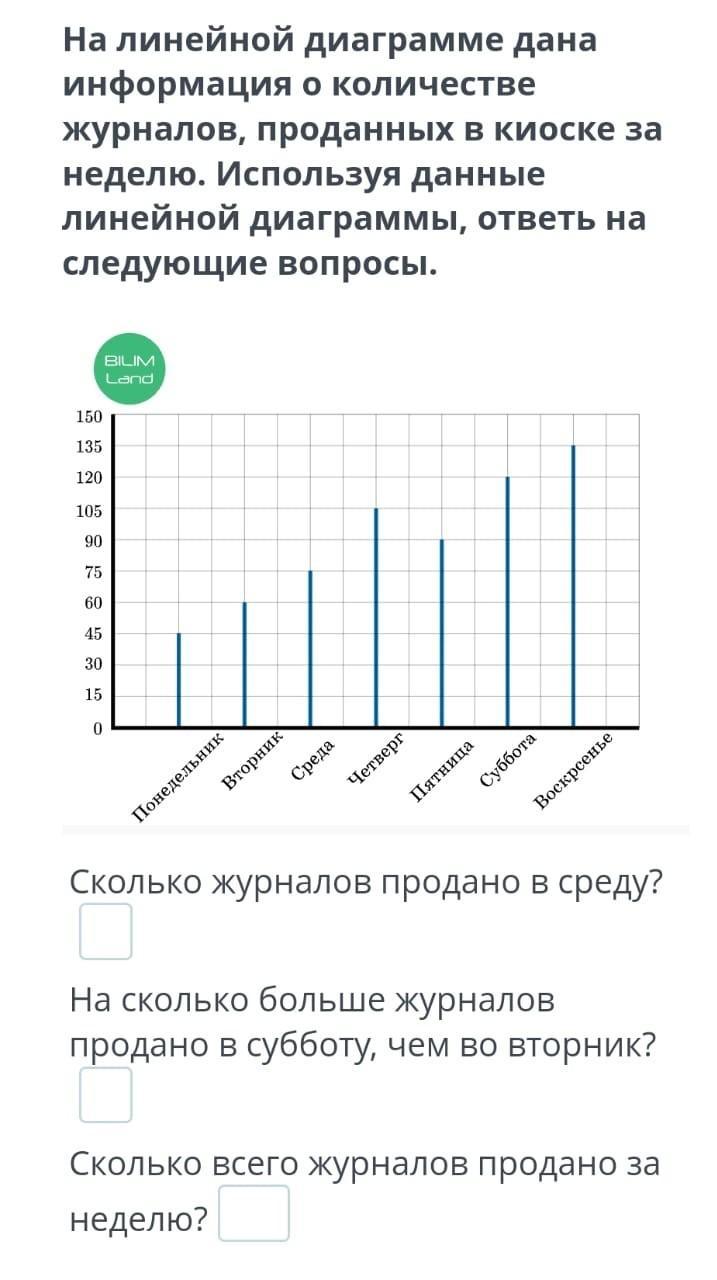 На линейной информация журналов, проданных в киоске за неделю. Используя данные линейной диаграммы, ответь на следующие вопросы. 150 135 120 105 90 С 75 60 45 30 15 Сколько журналов продано в среду? 0 BILIM Land диаграмме дана о количестве Вторник Понедельник Среда Четверг Суббота Пятница Воскрсенье На сколько больше журналов продано в субботу, чем во вторник? Сколько всего журналов продано за неделю?