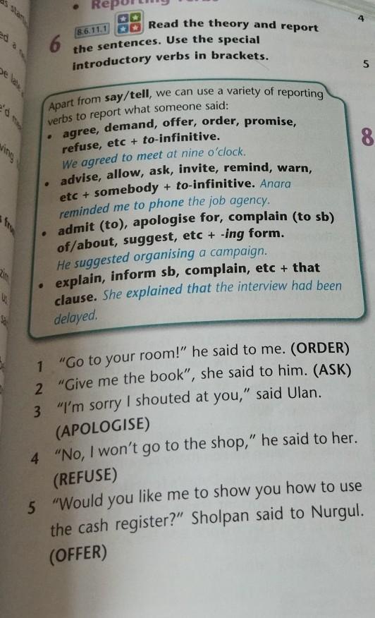 6 Read the theory and report the sentences. Use the special introductory verbs in brackets. 8.6.11.1 Apart from say/tell, we can use a variety of reporting verbs to report what someone said: • agree, demand, offer, order, promise, refuse, etc + to-infinitive. We agreed to meet at nine o'clock. . advise, allow, ask, invite, remind, warn, etc + somebody + to-infinitive. Anara reminded me to phone the job agency. . admit (to), apologise for, complain (to sb) of/about, suggest, etc + -ing form. He suggested organising a campaign. explain, inform sb, complain, etc + that clause. She explained that the interview had been delayed. 1 "Go to your room!" he said to me. (ORDER) 2 "Give me the book", she said to him. (ASK) "I'm sorry I shouted at you," said Ulan. (APOLOGISE) 3 4 "No, I won't go to the shop," he said to her. (REFUSE) 5 "Would you like me to show you how to use the cash register?" Sholpan said to Nurgul. (OFFER)
