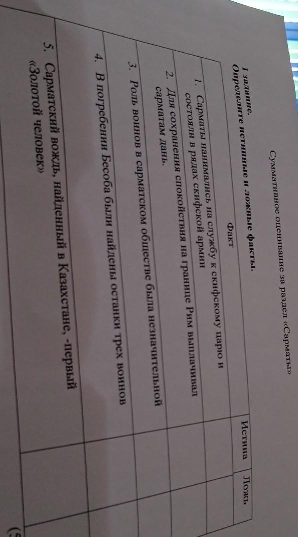 Суммативное оценивание за раздел «Сарматы>> 1 задание. Определите истинные и ложные факты. факт 1. Сарматы нанимались на службу к скифскому царю и состояли в рядах скифской армии 2. Для сохранения спокойствия на границе Рим выплачивал сарматам дань. 3. Роль воинов в сарматском обществе была незначительной 4. В погребении Бесоба были найдены останки трех воинов 5. Сарматский вождь, найденный в Казахстане, -первый «Золотой человек» Истина Лоя
