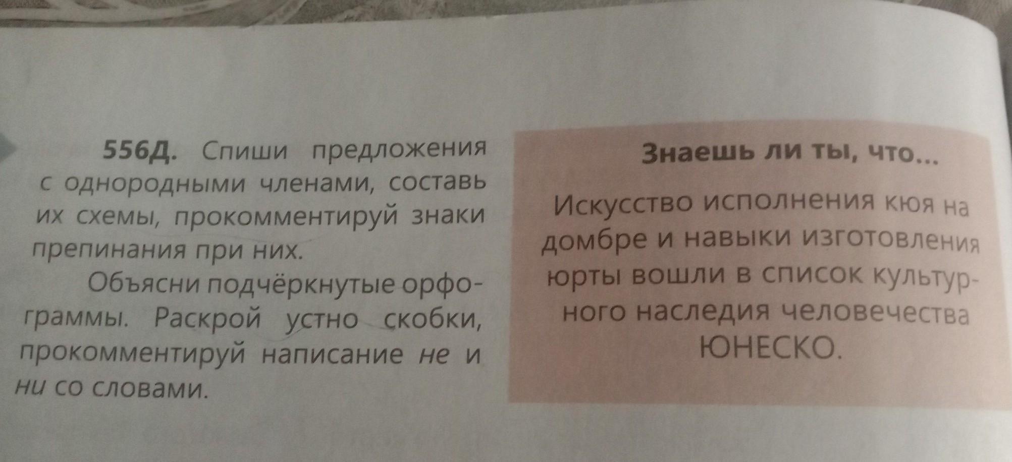 556Д. Спиши предложения с однородными членами, составь их схемы, прокомментируй знаки препинания при них. Объясни подчёркнутые орфо- граммы. Раскрой устно скобки, прокомментируй написание не и ни со словами. Знаешь ли ты, что... Искусство исполнения кюя на домбре и навыки изготовления юрты вошли в список культур- ного наследия человечества ЮНЕСКО.