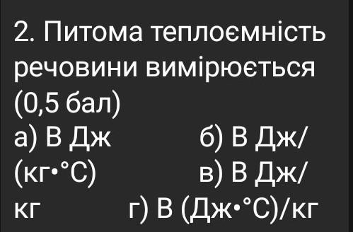 2. Питома теплоємність речовини вимірюється (0,5 бал) а) в Дж (кг.°C) КГ б) в Дж/ в) В Дж/ г) В (Дж•°C)/кг