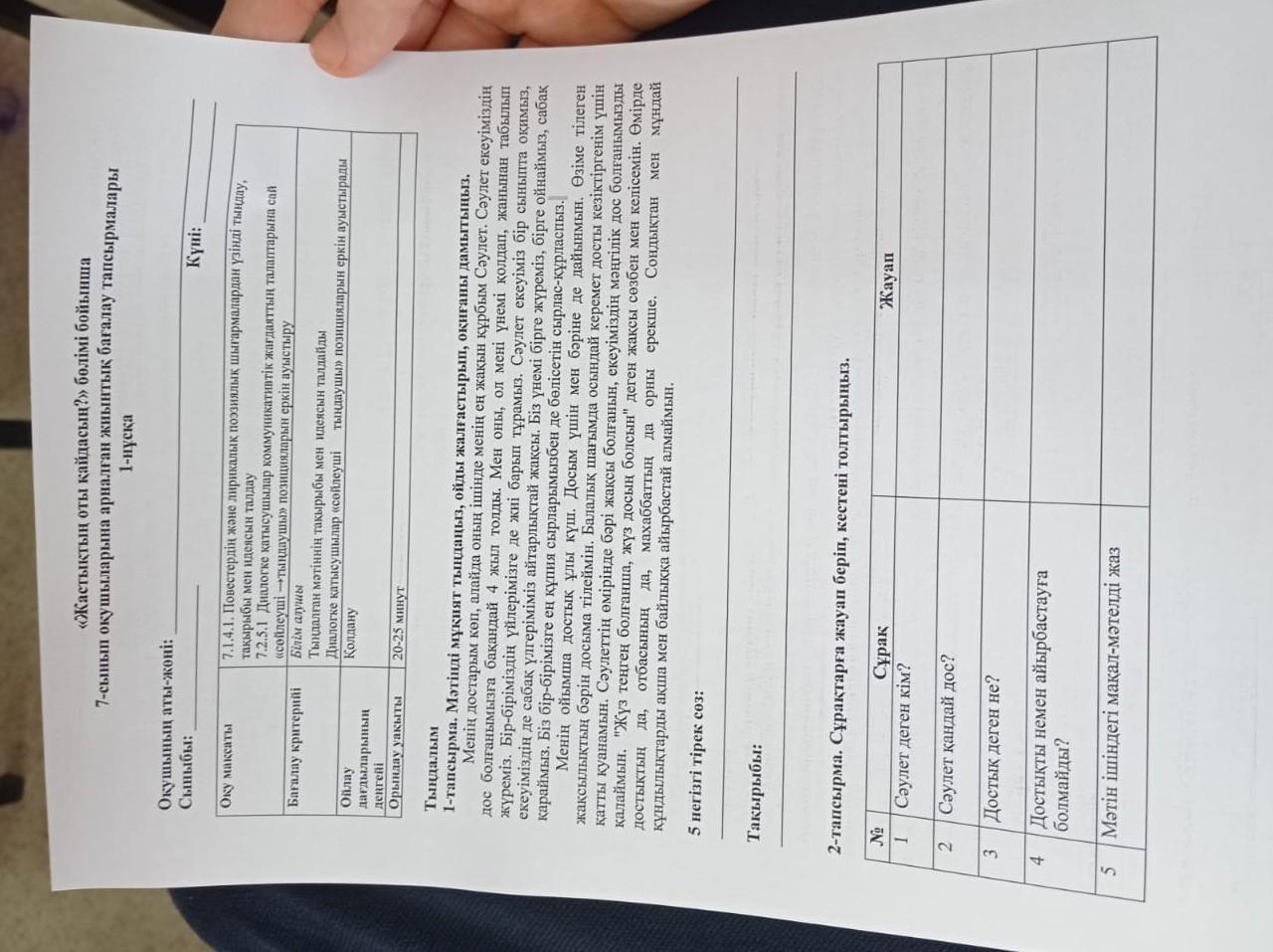 5 2-тапсырма. Сұрақтарға жауап беріп, кестені толтырыныз. Сұрақ 4 3 №₂ I 2 Сәулет деген кім? Сәулет кандай дос? Достык деген не? Достыкты немен айырбастауға болмайды? Мәтiн iшiндегi макал-мәтелдi жаз Жауап