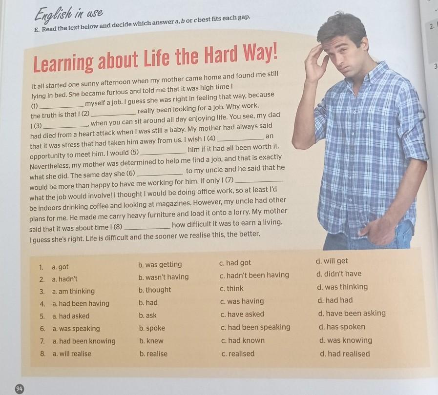 Learning about Life the Hard Way! It all started one sunny afternoon when my mother came home and found me still lying in bed. She became furious and told me that it was high time I (1) the truth is that I (2) 1 (3) myself a job. I guess she was right in feeling that way, because really been looking for a job. Why work, when you can sit around all day enjoying life. You see, my dad had died from a heart attack when I was still a baby. My mother had always said that it was stress that had taken him away from us. I wish I (4) an opportunity to meet him. I would (5) him if it had all been worth it. Nevertheless, my mother was determined to help me find a job, and that is exactly what she did. The same day she (6) to my uncle and he said that he would be more than happy to have me working for him. If only I (7) what the job would involve! I thought I would be doing office work, so at least I'd be indoors drinking coffee and looking at magazines. However, my uncle had other plans for me. He made me carry heavy furniture and load it onto a lorry. My mother said that it was about time I (8) how difficult it was to earn a living. I guess she's right. Life is difficult and the sooner we realise this, the better. 1. 2 a.got a hadn't b. was getting c. had got d. will get
