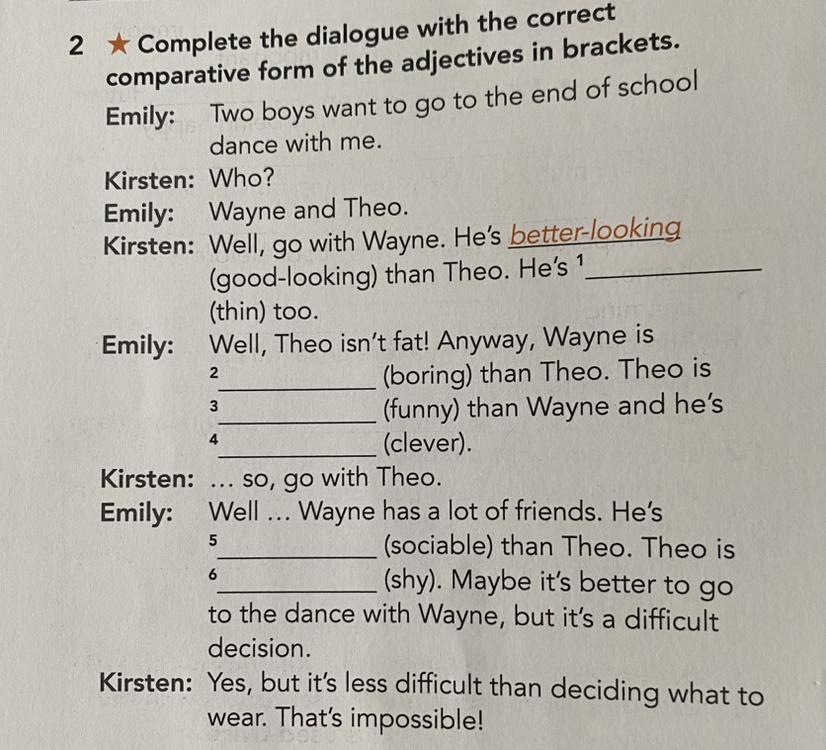 ПОМОГИТЕ ПОЖАЛУЙСТА Complete the dialogue with the correct comparative form of the adjectives in brackets. p.50 ex.2(WB FOCUS 1)