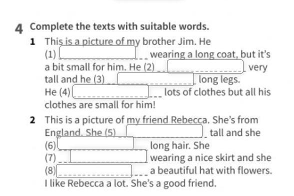 2 This is a picture of my friend Rebecca. She's from England. She (6) is very tall and she (7) has long hair. She (8) is wearing a nice skirt and she (9) has a beautiful hat with flowers. I like Rebecca a lot. She's a good friend.
