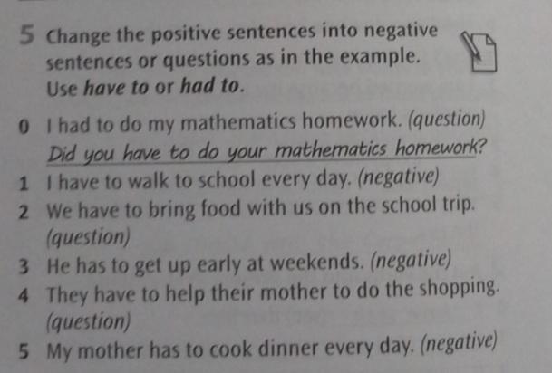 1. I don't have to walk to school every day. 2. Do we have to bring food with us on tne school trip? 3. He doesn't have toget up early at the weekends.Do they have to help their mother to do the shopping? 5. My mother doesn't have to cook dinner every day.