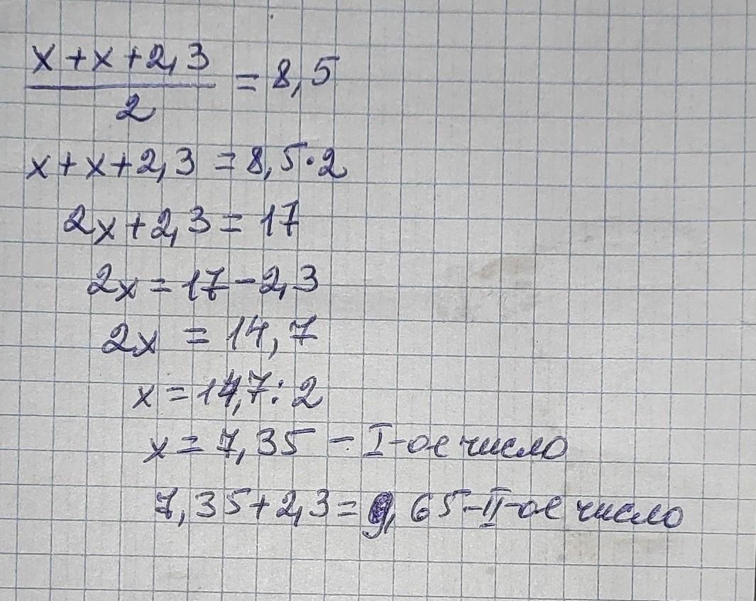 Среднее арифметическое двух чисел 8,5 найди эти числа если одно из них на 2,3 больше другого. Помогите СРОЧНО пожалуйста