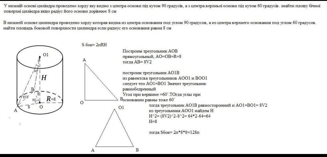 У нижній основі циліндра проведено хорду, яку видно з центра нижньої основи під кутом 90°, а з центра верхньої основи під кутом 60°. Знайдіть об'єм та площу бічної поверхні циліндра, якщо його радіус основи дорівнює 25 см.