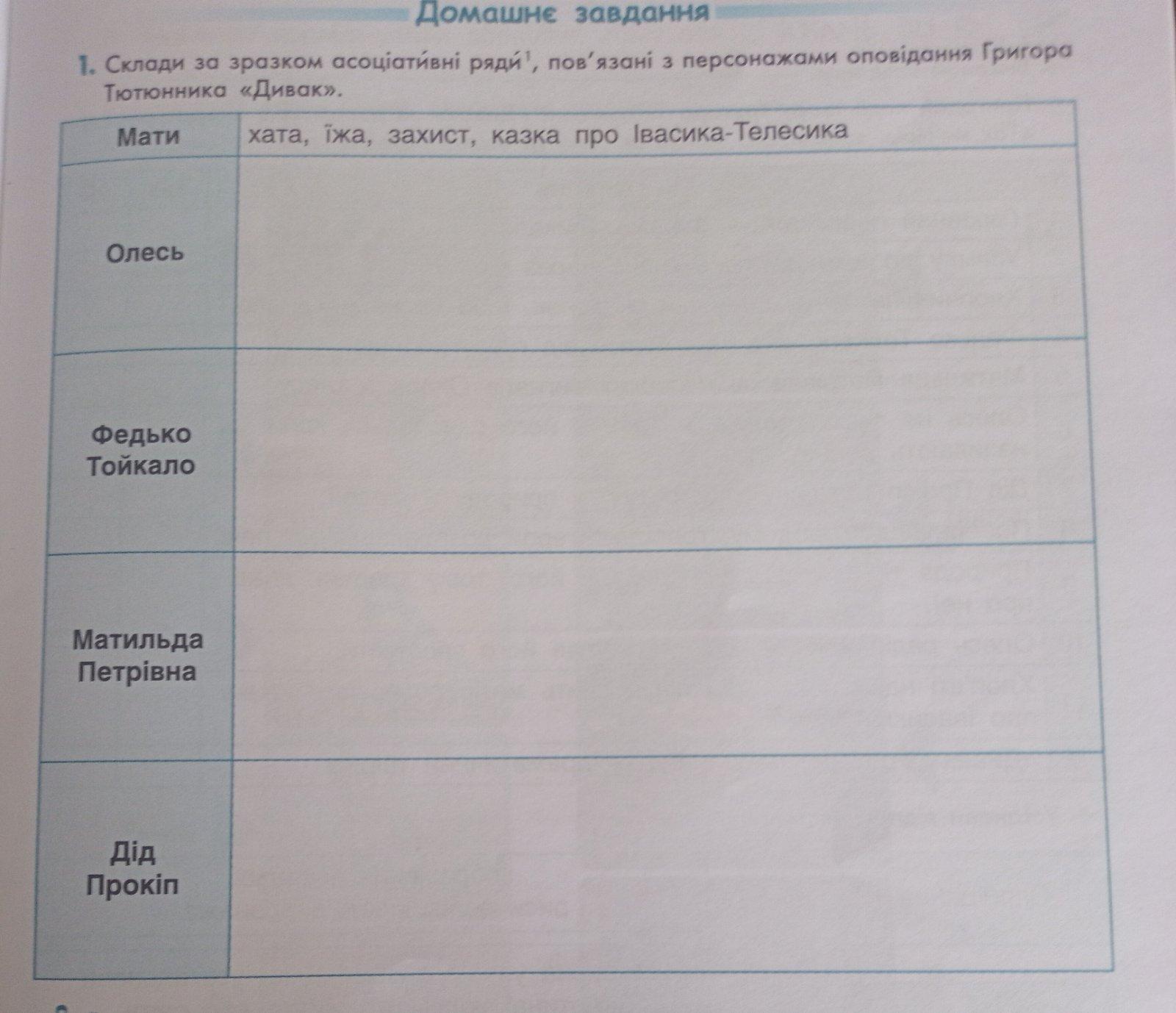 Склади за зразком асоціативні ряди пов'язані з персонажами оповідання Грирорія Тютюнника "Дивак"
