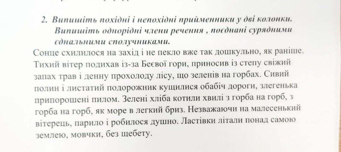 Однорідні члени речення, поєднані сурядними еднальними сполучниками: "Сонце схилилося на захід і не пекло вже так дошкульно", "Тихий вітер подихав із-за Беєвої гори", "приносив із степу свіжий запах трав і денну прохолоду лісу", "Сивий полин і листатий подорожник купилися обабіч дороги", "купилися обабіч дороги, злегенька припорошені пилом", "котили хвилі з горба на горб, з горба на горб", "Ластівки літали понад самою землею, мовчки, без щебету".