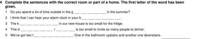 4 Complete the sentences with the correct room or part of a home. The first letter of the word has been given. 1 Do you spend a lot of time outside in the g in the summer? 2 I think that I can hear your alarm clock in your b 3 The k 4 This d 5 We've got two t in our new house is too small for the fridge. is too small to invite so many people to dinner. One in the bathroom upstairs and another one downstairs.