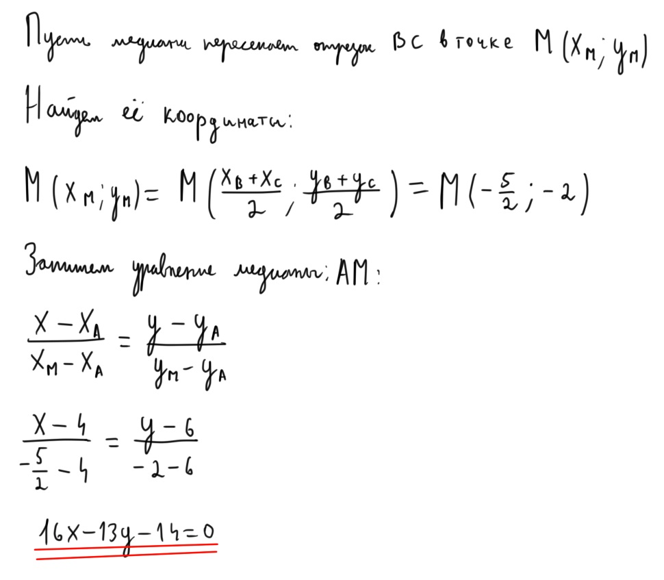 Даны координаты вершин треугольника ABC: А (4; 6), В (-4; 0), С (-1; -4). Напишите уравнение медианы,проведённой из вершины А.