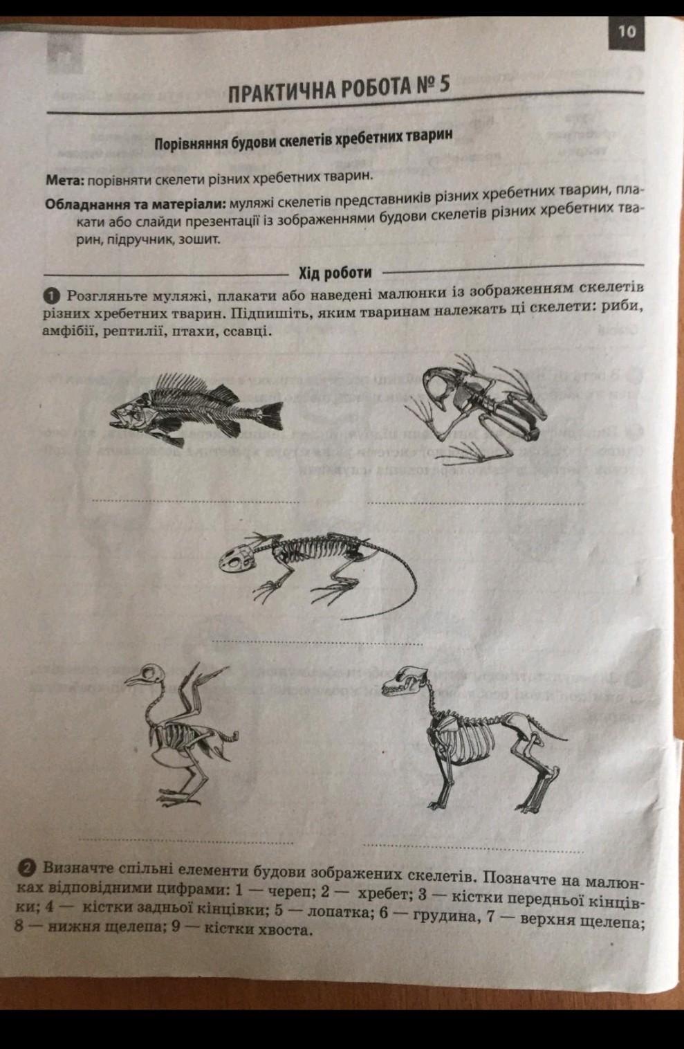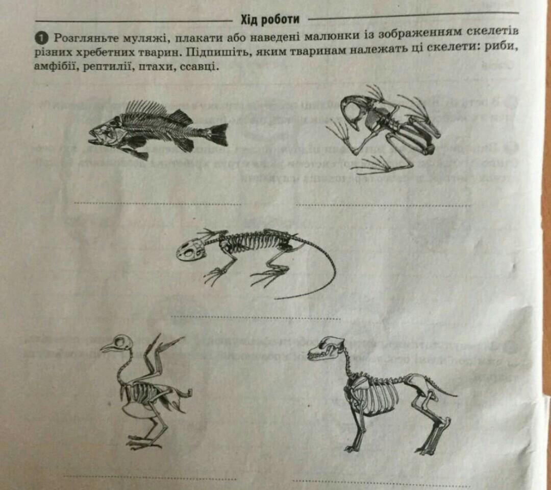 рин, підручни Хід роботи Розгляньте муляжі, плакати або наведені малюнки із зображенням скелетiн різних хребетних тварин. Підпишіть, яким тваринам належать ці скелети: риби, амфібії, рептилії, птахи, ссавці.
