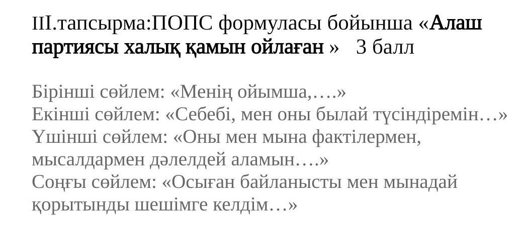 III.тапсырма:ПОПС формуласы бойынша «Алаш партиясы халық қамын ойлаған »