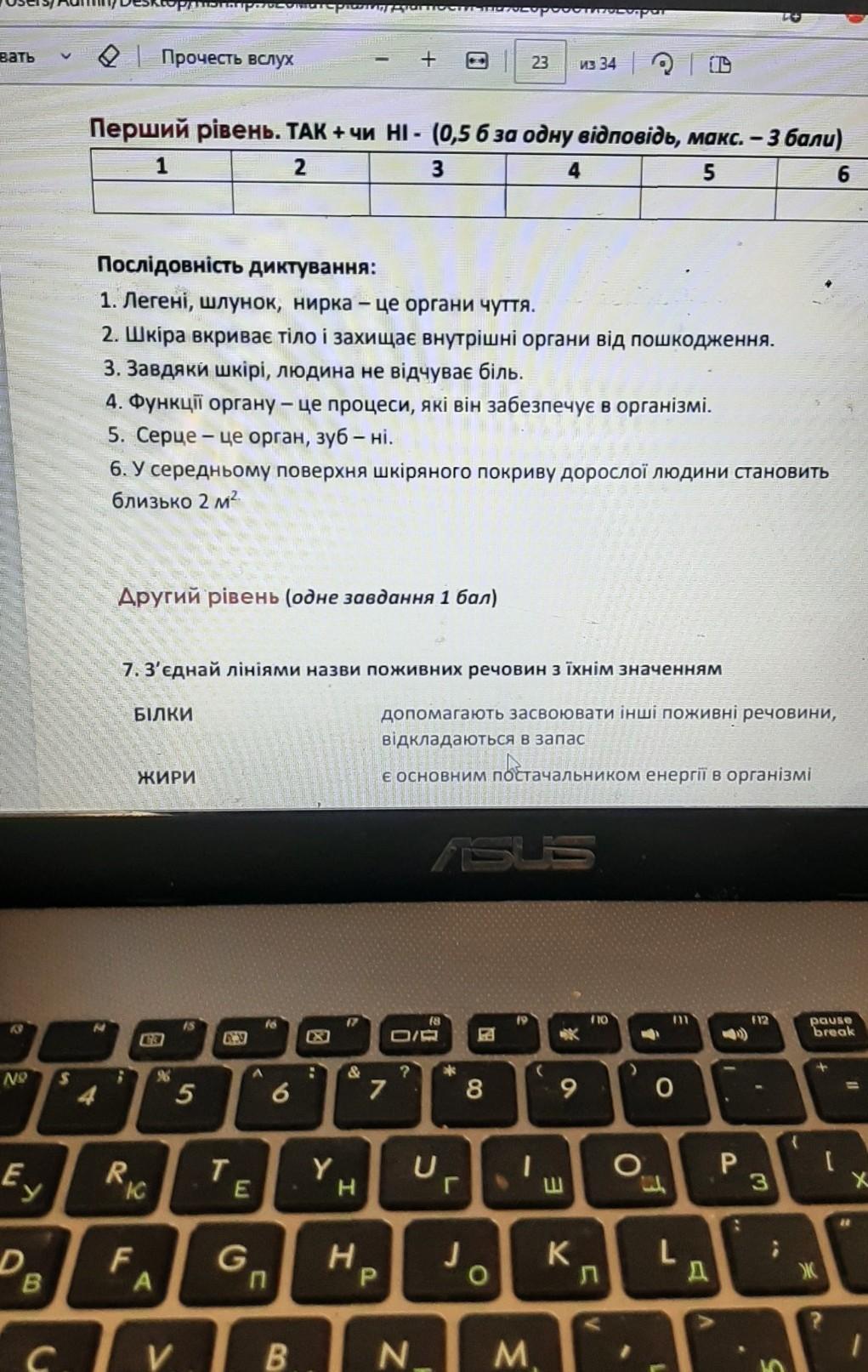 5 клас Дагностична робота No5 17 Розділ V. Тема: Пізнаємо організм людини в середовищі його існування Перший рівень. ТАК + чи НI - (0,5 6 за одну відповідь, макс. – 3 бали) - 1 2 3 4 5 Послідовність диктування: 1. Легені, шлунок, нирка — це органи чуття. 2. Шкіра вкриває тіло і захищає внутрішні органи від пошкодження. 3. Завдяки шкірі, людина не відчуває біль. 4. Функції органу - це процеси, які він забезпечує в організмі. 5. Серце - це орган, зуб - ні. 6. У середньому поверхня шкіряного покриву дорослої людини становить близько 2 м² ADVELY ninour lodus soodsuma 1 Goal 61 сроччнноооо