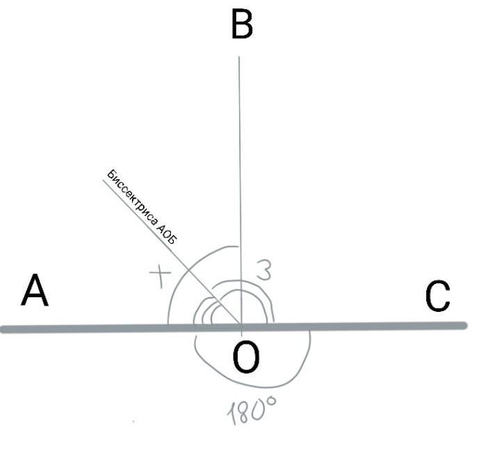 ДАНО: углы АОВ и ВОС - смежные,биссектриса угла АОВ, угол образованный от биссектрисы угла АОВ и луча ОС (Я назову его- угол 3).