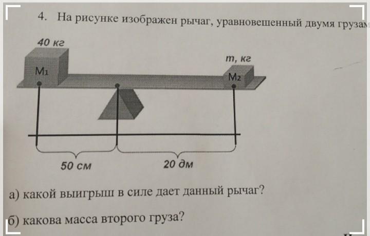 4. На рисунке изображен рычаг, уравновешенный двумя грузам. а) какой выигрыш в силе дает данный рычаг? б) какова масса второго груза?