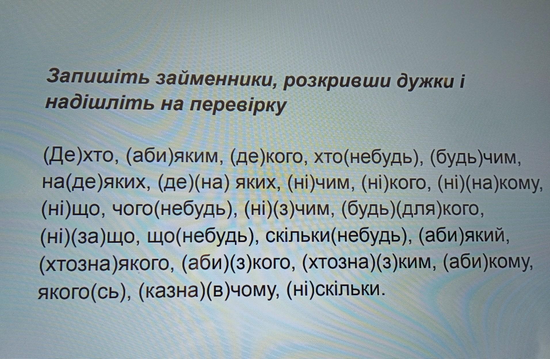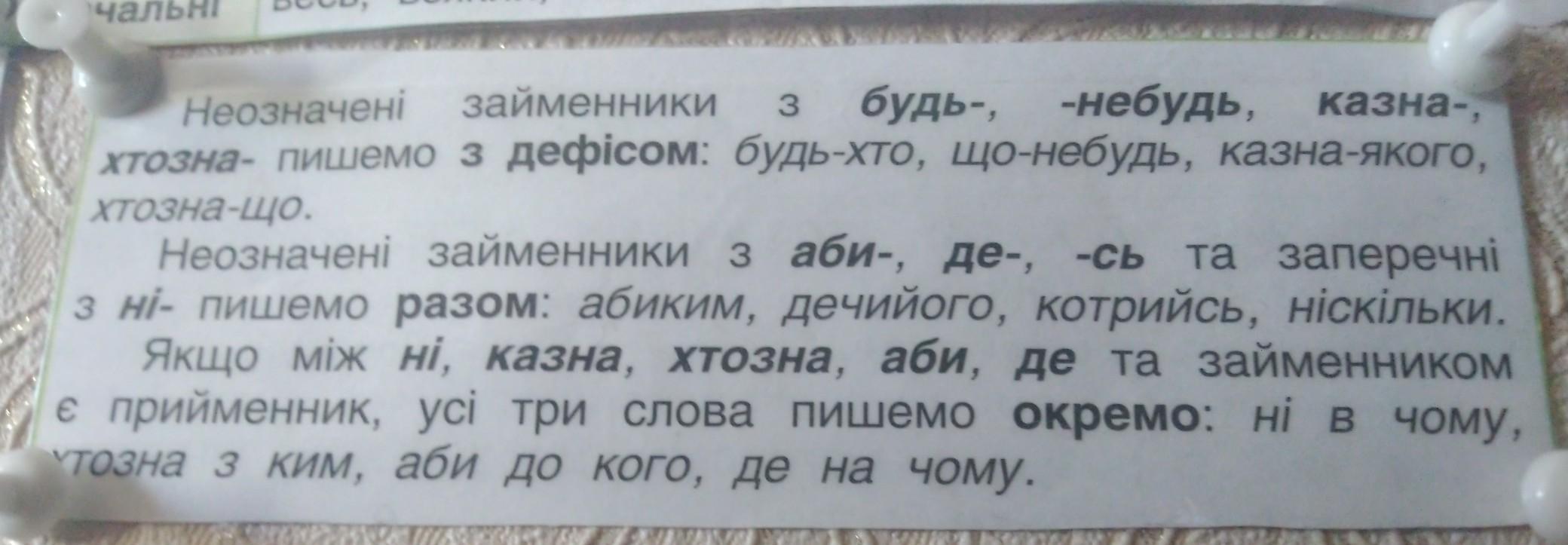дехто, абияким, декого, хто-небудь, будь-чим, на деяких, де на яких, нічим, нікого, ні на кому, ніщо, чого-небудь, ні з чим, будь для кого, ні за що, що-небудь, скільки-небудь, абиякий, хтозна-якого, аби з кого, хтозна з ким, абикому, якогось, казна в чому, ніскільки.
