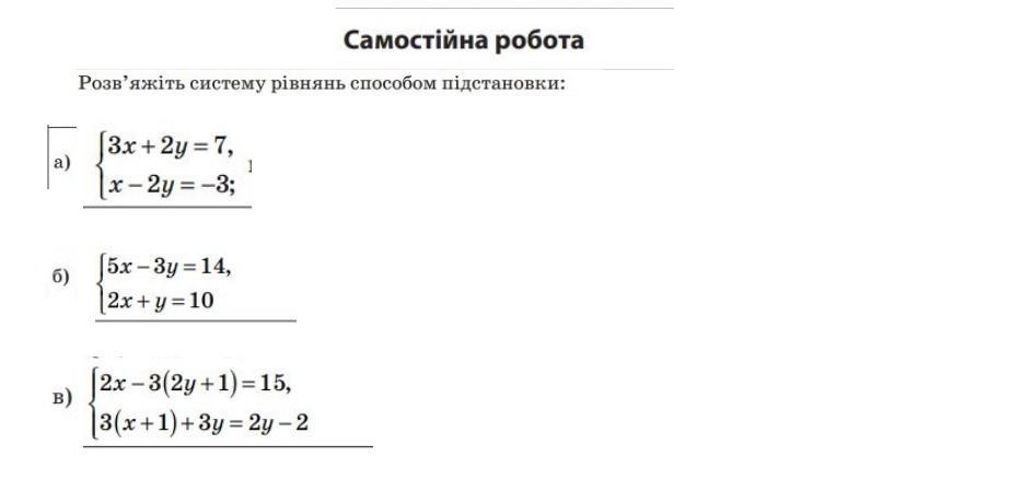 Самостійна робота. Розв'яжіть систему рівнянь способом підстановки:​