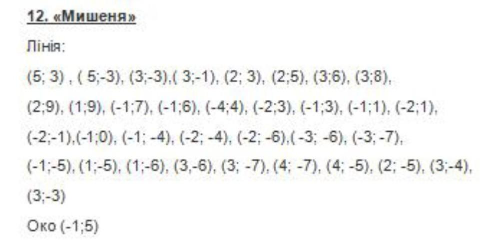 12. «Мишеня» Лiнiя: (5; 3), (5:-3), (3;-3).( 3;-1), (2; 3), (2;5), (3;6), (3;8), (2:9), (1;9), (-1;7),(-1;6), (-4;4), (-2;3), (-1;3), (-1;1), (-2;1), (-2;-1),(-1;0), (-1; -4), (-2; -4), (-2; -6).(-3; -6), (-3; -7), (-1:-5), (1;-5), (1;-6), (3,-6), (3; -7), (4; -7), (4; -5), (2; -5), (3;-4), (3:-3) Око (-1:5)