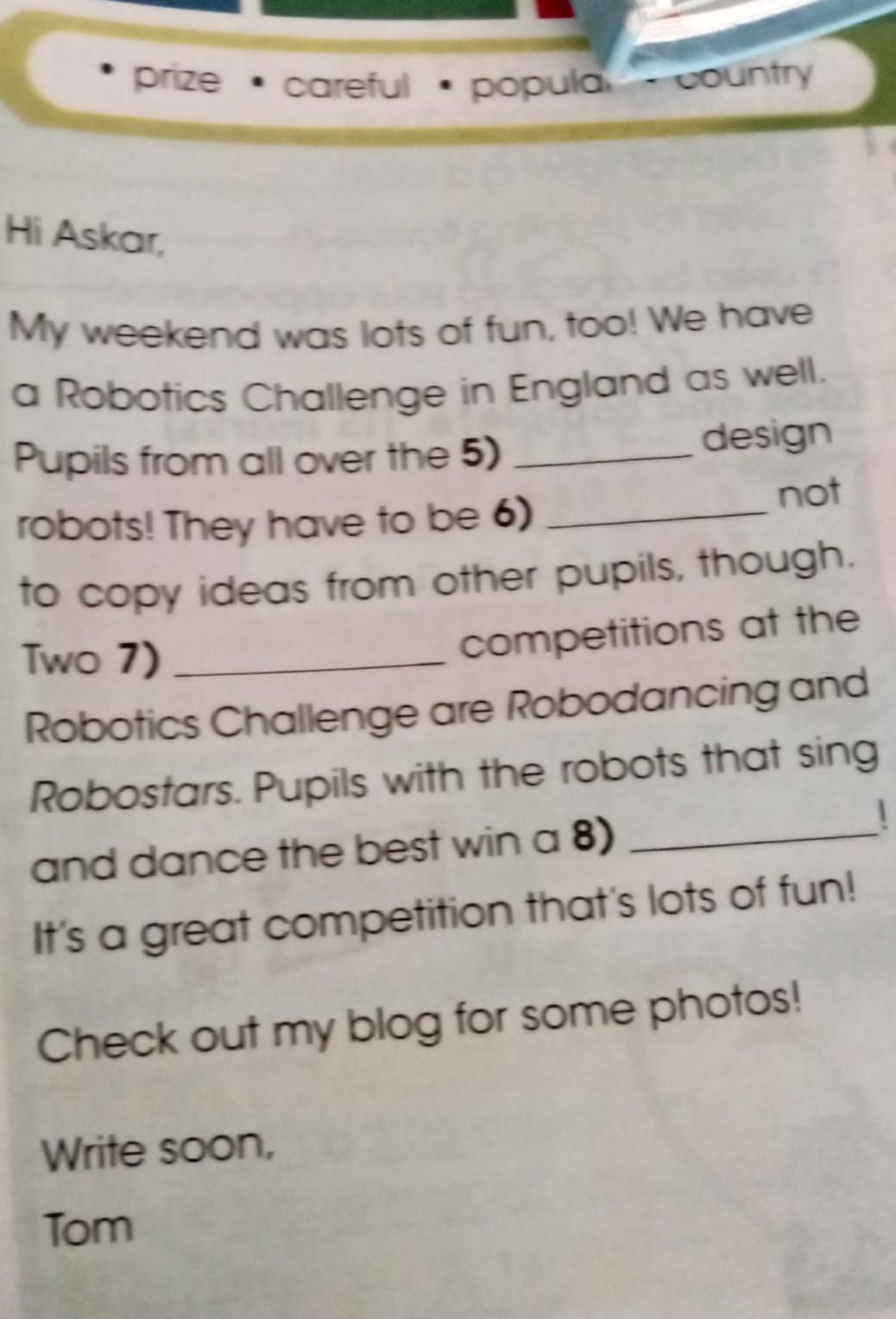 prize careful popular country Hi Askar, ● My weekend was lots of fun, too! We have a Robotics Challenge in England as well. Pupils from all over the 5) design not robots! They have to be 6) to copy ideas from other pupils, though. Two 7) competitions at the Robotics Challenge are Robodancing and Robostars. Pupils with the robots that sing and dance the best win a 8) It's a great competition that's lots of fun! Check out my blog for some photos! Write soon, Tom