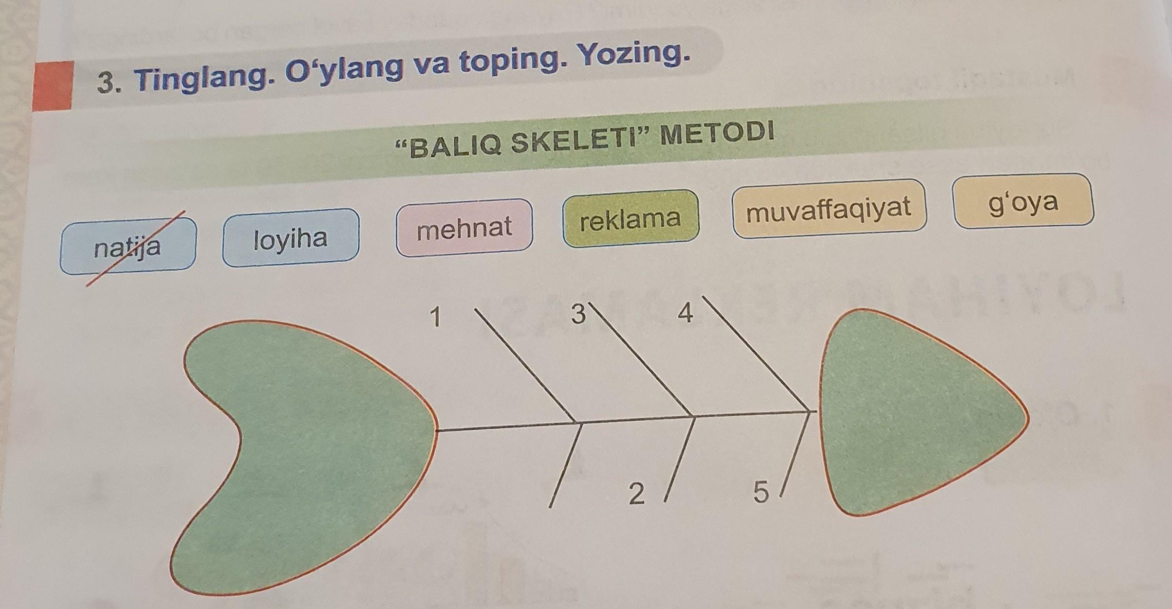 3. Tinglang. O'ylang va toping. Yozing. natija loyiha "BALIQ SKELETI" METODI mehnat 1 reklama 3 2 4 muvaffaqiyat 5 g'oya