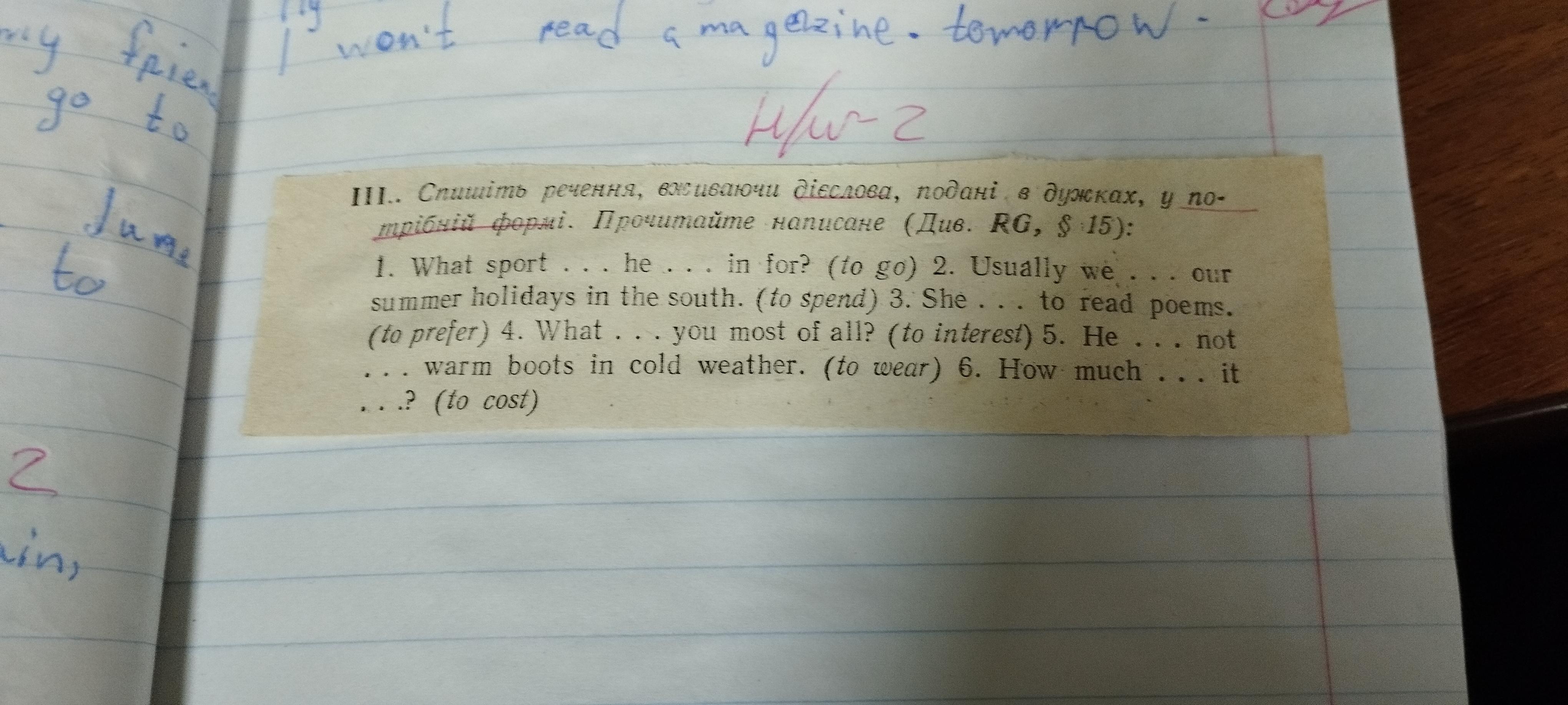 1- does, go 2- spend, 3- prefers 4- do interest, 5- does, wear 6- does,cost.
