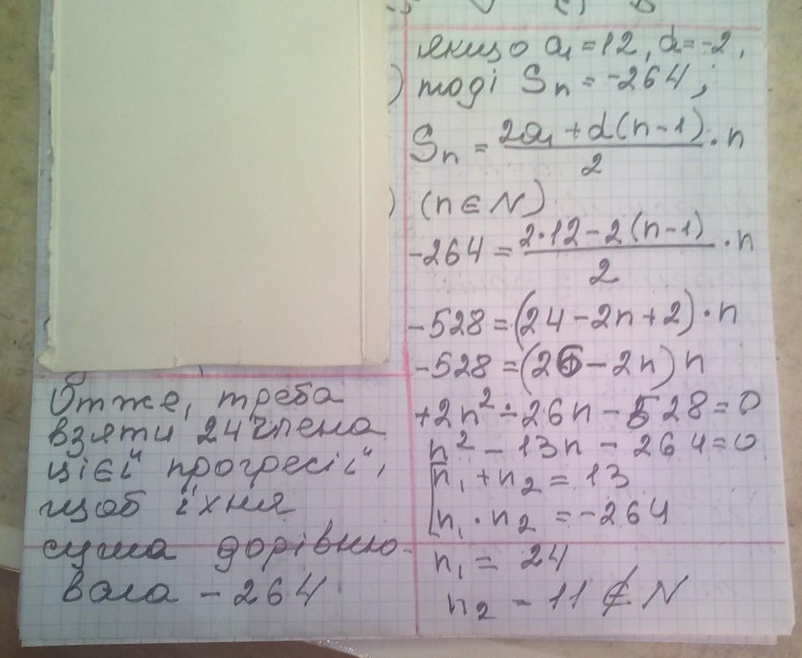 Перший член арифметичної прогресії дорівнює 12, а різ- ниця дорівнюе -2. Скільки треба взяти перших членів прогресії, щоб їхня сума дорівнювала -264 ?