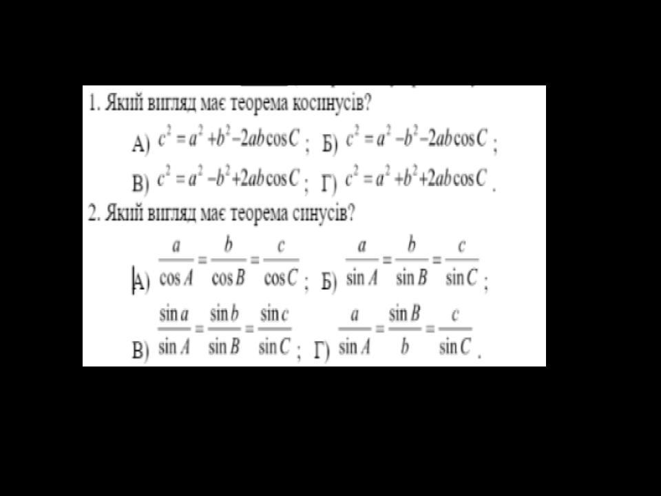 1. A) c^2 = a^2 + b^2 - 2ab * cos(α)