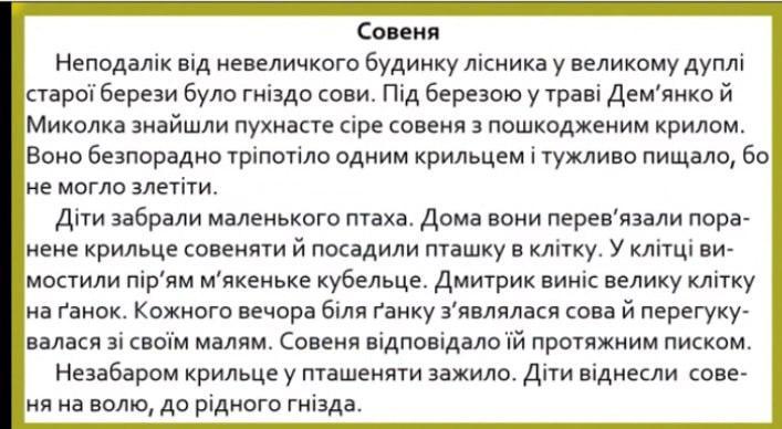 біля хати лісника було велике дерево там де жила сова хлопчики знайшли пухнасте сіре совеня з підбитим крилом і він не міг літати дома хлопці перев'язали крило й посадили сову в клітку Дмитрик виніс клітку на ґанок з'явялася сова й перегукувалися зі своїм малям Совеня відповідало писком Раптом у сови ожило крильце діти віднесли сову на волю до гнізда.