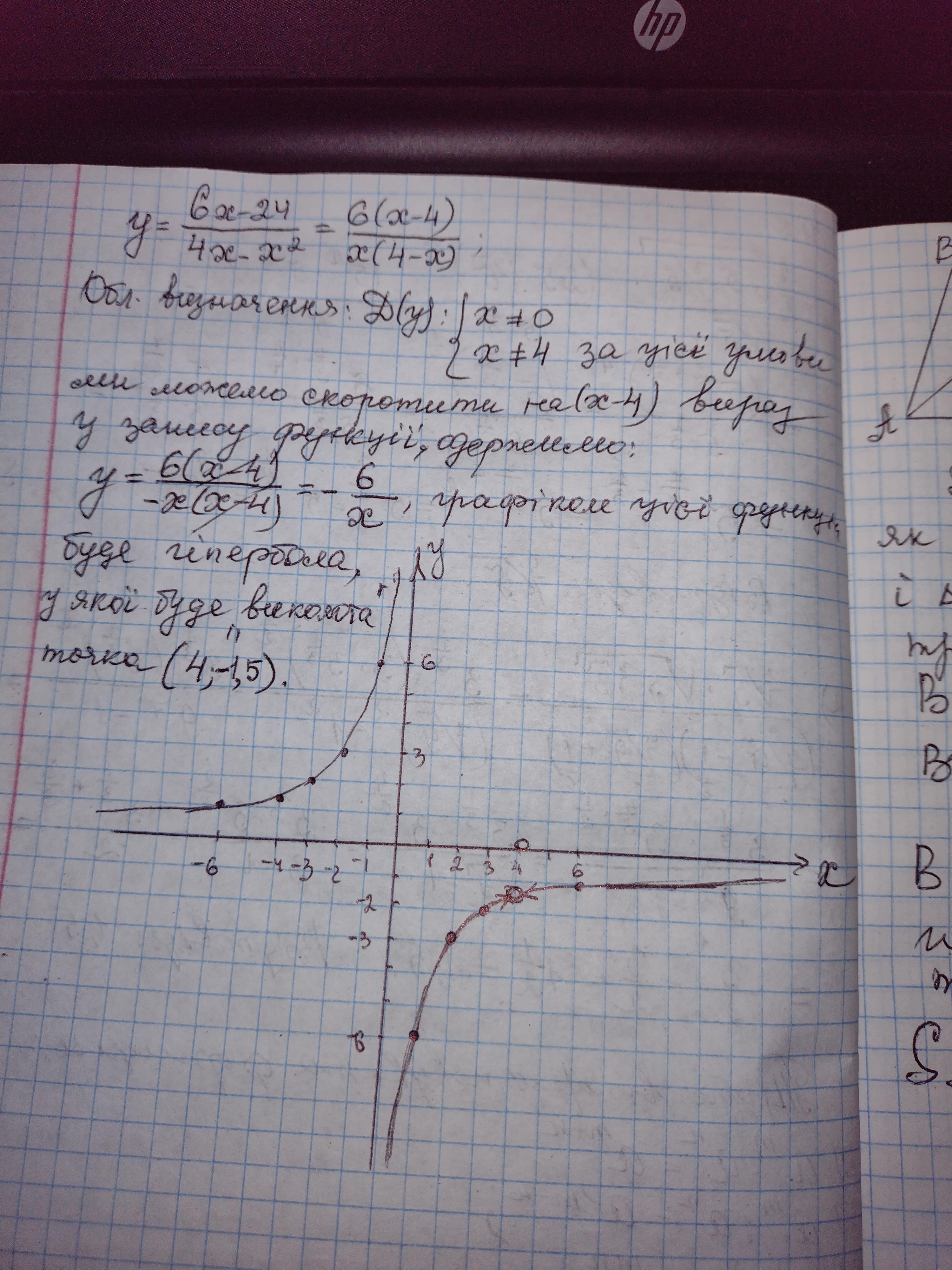 у=-6/х; х#4. Єто просто гипербола с выколотой точкой (4;-1,5)