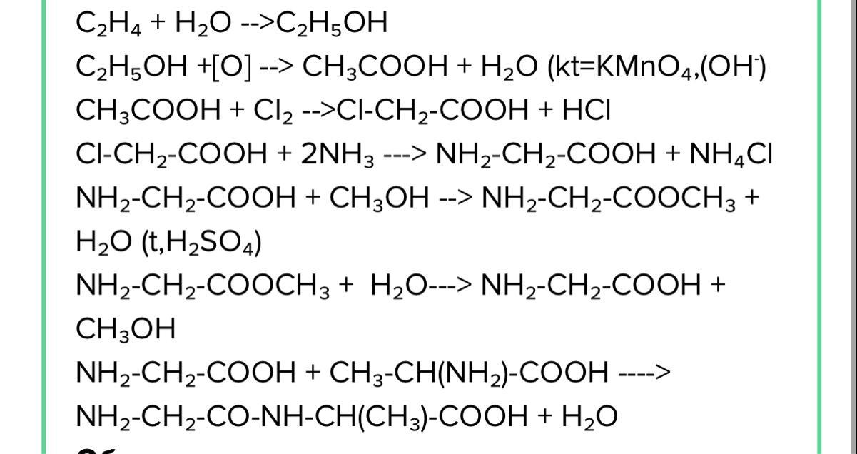 етен → етанол → етанова кислота → хлоретанова кислота → аміноетанова кислота → метиловий естер аміноетанової