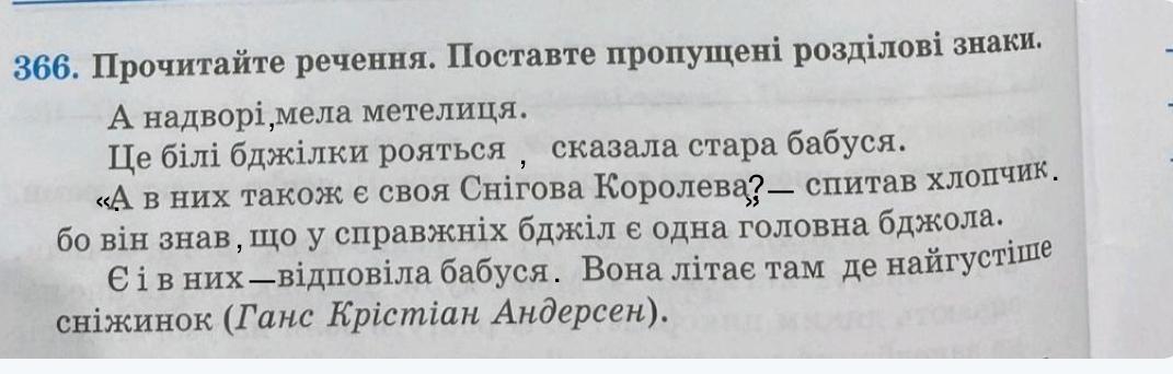 це білі бджілки рояться, сказала стара бабуся. А в них також є своя Снігова королева? Спитав хлопчик бо він знав ,що справжніх бджіл є одна головна бджола. Є і, в них ,вдповіла бабуся.Вона літає є там де найгустіша сніжинок.