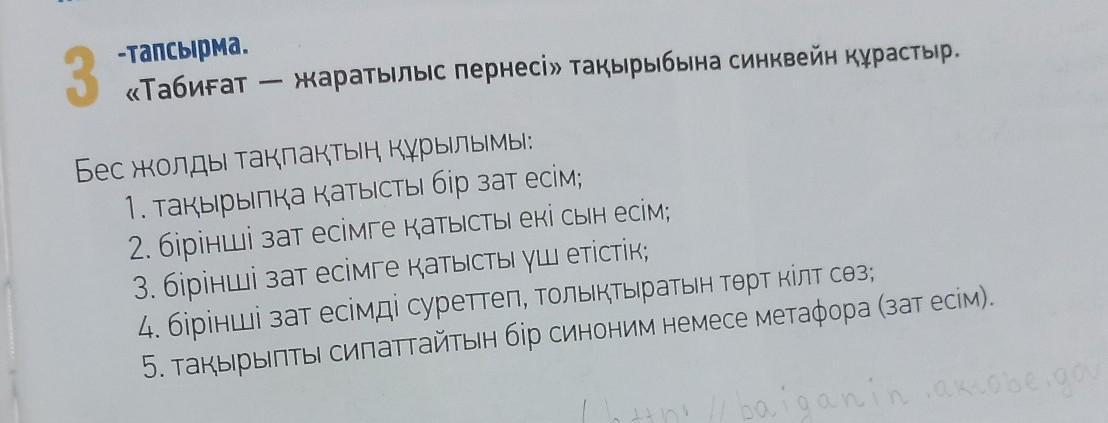 T; -тапсырма. 3 «Табиғат жаратылыс пернесі>> тақырыбына синквейн кұрастыр. Бес жолды такпақтың құрылымы: 1. такырыпка катысты бiр зат есiм: 2. бірінші зат есімге қатысты екi сын есім: 3 бiрiншi зат есімге қатысты уш етiстiк; 4. бірінші зат есімді суреттеп, толықтыратын терт кілт сөз: 5. такырыпты сипаттайтын бiр синоним немесе метафора (зат ес