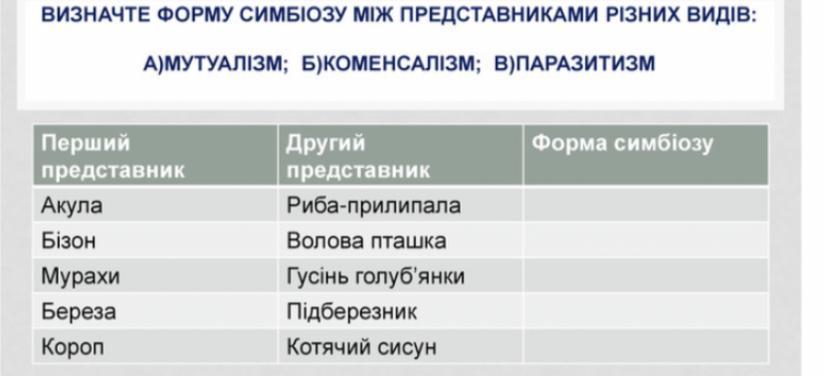 ВИЗНАЧТЕ ФОРМУ СИМБІОЗУ МІЖ ПРЕДСТАВНИКАМИ РІЗНИХ ВИДІВ: