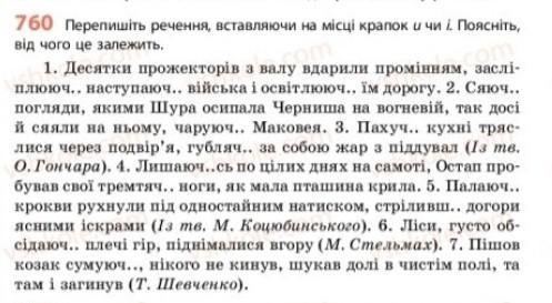 760 Перепишіть речення, вставляючи на місці крапок и чи і. Поясніть, від чого це залежить. 1. Десятки прожекторiв з валу вдарили промінням, заслi- плююч.. наступаюч.. війська і освітлююч.. Їм дорогу. 2. Сяюч.. погляди, якими Шура осипала Черниша на вогневiй, так досi й сяяли на ньому, чаруюч.. Маковея. 3. Пахуч.. кухні тряс- лися через подвір'я, губляч.. за собою жар з пiддувал (1з тв. О. Гончара). 4. Лишаюч..сь по цілих днях на самоті, Остап про- бував свої тремтяч., ноги, як мала пташина крила. 5. Палаюч.. крокви рухнули під одностайним натиском, стріливш.. догори ясними іскрами (13 тв. М. Коцюбинського). 6. Ліси, густо об- сiдаюч.. плечi гiр, пiднiмалися вгору (М. Стельмах). 7. Пішов козак сумуюч.., нікого не кинув, шукав долі в чистім полі, та там і загинув (Т. Шевченко).