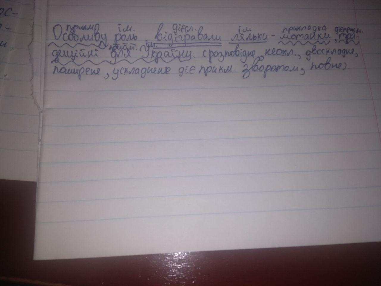 Зробіть будь ласка на аркуші синтаксичний розбір речення «Особливу роль відігравали ляльки-мотанки, традиційні для України» на рівні 8 класу, тобто зі зворотами, якщо є, з надписами частин мови і підкресленням членів речення.