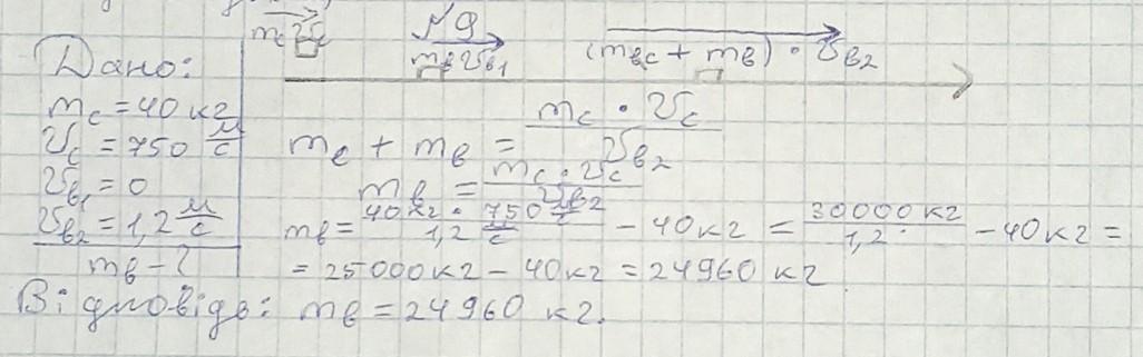 9 клас. Снаряд масою 40 кг, що летить зі швидкістю 750 м/с, потрапляє у нерухомий вагон, навантажений піском і застряє в ньому. Вагон внаслідок цього почав рухатись зі швидкістю 1,2 м/с. Яка маса вагона?