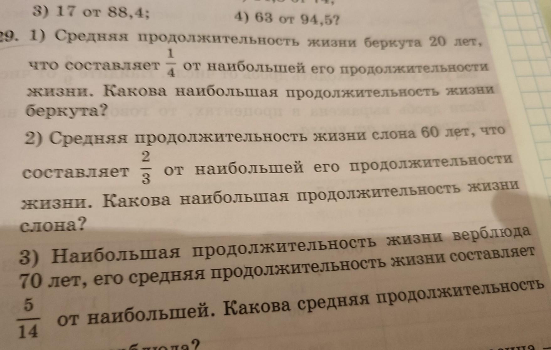 % от 40 тыс. ньше, чем ва ставляет от другогo: 2) 14,8 or 74; 4) 63 от 94,57 3) 17 от 88, 4; 829. 1) Cредняя продолжительность жизни беркута 20 лет. что составляет от наибольшей его продолжительности скла жизни. Какова наибольшая продолжительность жизни беркута, от 2) Средняя продолжительность жизни слона 60 лет, что от наибольшей его продолжительности жизни. Какова наибольшая продолжительность жизни составляет 3 слона? 3) Наибольшая продолжительность жизни верблюда 70 лет, его средняя продолжительность жизни составляет 5 14 от наибольшей. Какова средняя продолжительность жизни верблюда?