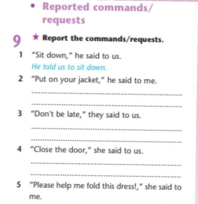 1 "Sit down," he said to us. He told us to sit down. 2 "Put on your jacket," he said to me. 3 "Don't be late," they said to us. 4 "Close the door," she said to us. 5 "Please help me fold this dress!," she said to me. *****