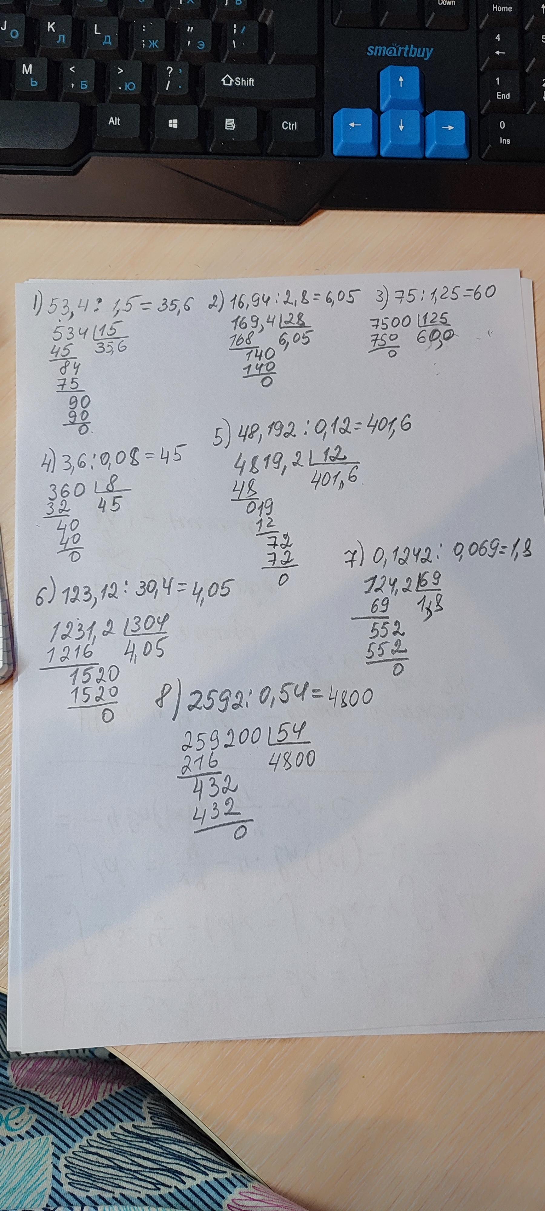 Разберись с переносом запятых при делении и пользуйся таблицей умножения. Удачи на контрольной работе по математике!